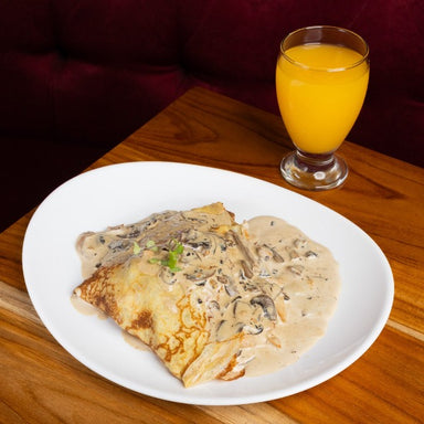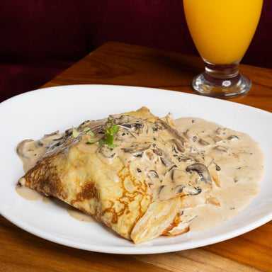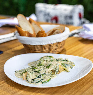 Crepe con camarones flameados con vino blanco y servido con salsa de crema, zucchini y eneldo.