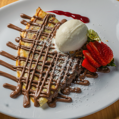 Crêpe con salsa de chocolate de la casa, almendras rebanadas caramelizadas y helado de vainilla.