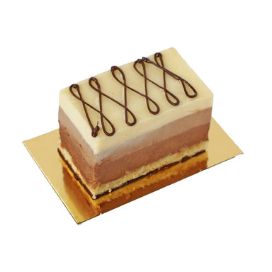 Mousse de tres chocolates (negro, leche y blanco) con un bizcocho de almendras. Un postre muy suave y muy francés.
