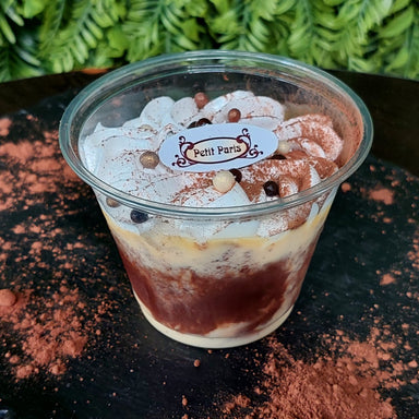 Exquisito tiramisu realizado con ligero bizcocho mojado de sirope de café y cubierto de crema mascarpone saboreado a café.