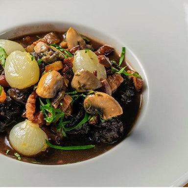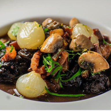 $32.95Estofado de res en vino tinto, tocino, hongos, zanahoria, acompañado de puré de papa de la casa.