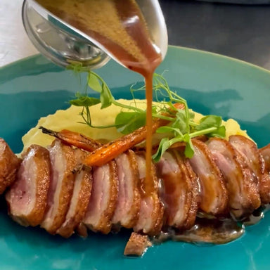 $32.95Pato servido con salsa de naranja, acompañado con puré de papas y zanahorias bebés glaseadas.