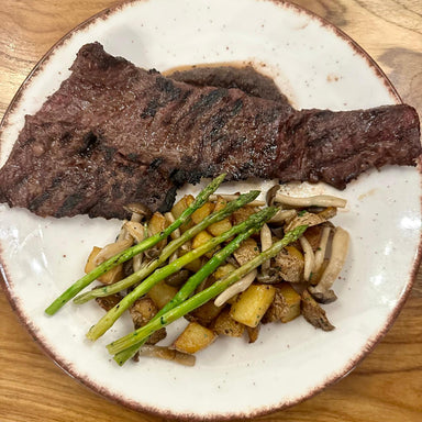 $35.95Entraña al grill con hongos salteados, papines y mermelada de cebolla asada con romero.