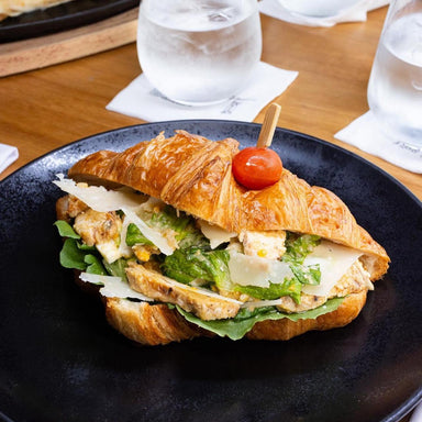 $11.95Nuestro croissant de mantequilla relleno de filete de pollo, queso parmesano, lechuga, huevo y tomate seco con su aderezo cesar.