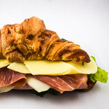 $11.95Nuestro croissant de mantequilla relleno jamón ahumado, jamón prosciutto, queso mozarella y queso Edam.