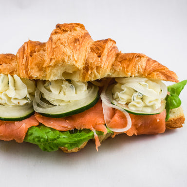 $11.95Nuestro croissant de mantequilla relleno de salmón ahumado, queso crema con eneldo, cebolla blanca, pepino y lechuga mixta.